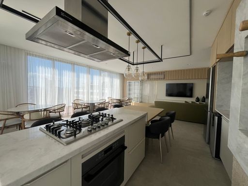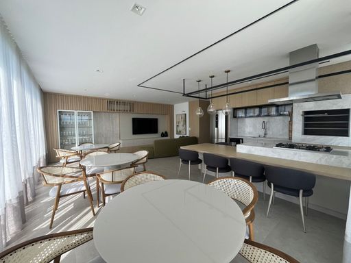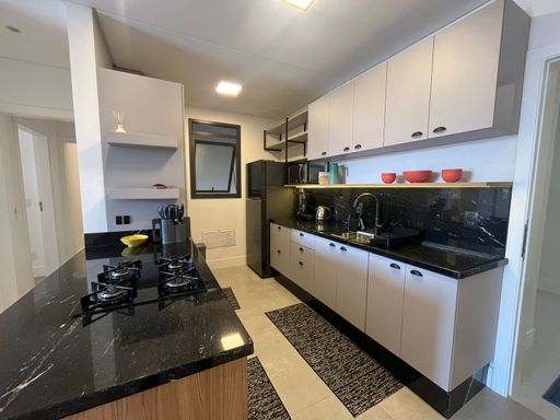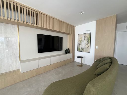 O apartamento será entregue com móveis planejados: armários nos 2 dormitórios, armários nos 3 banheiros. A sala entregue com rack e com a TV. A cozinha também será entregue com móveis planejados e eletrodomésticos: Geladeira, forno, cooktop, lava e seca.