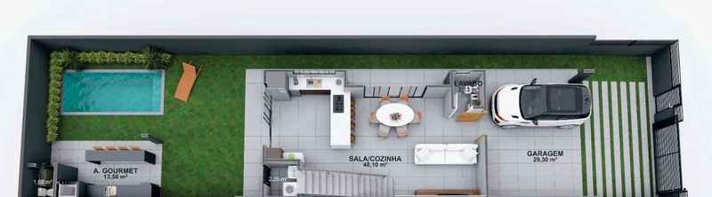 O projeto é moderno e funcional, com 3 suítes, sala ampla integrada à cozinha, lavabo e uma área de churrasqueira com banheiro de apoio, ideal para receber amigos e família com conforto.